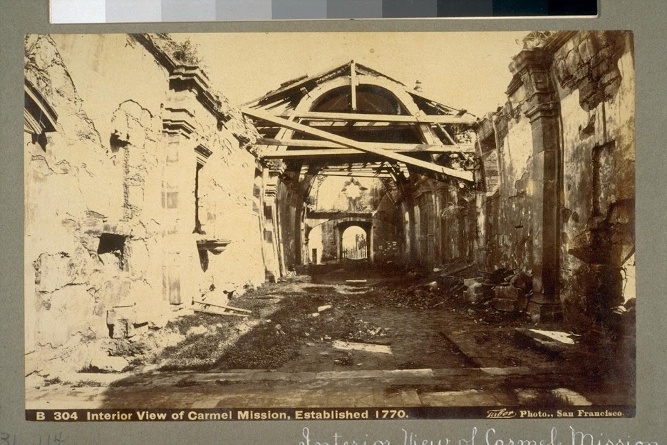As you previously read, there was a lot of turmoil going on in California history and decades of time is virtually lost. A journal entry discovered from William Brewer from May 4, 1861 stated, "We visited the old Mission of Carmelo... It is now a complete ruin, entirely desolate, not a house is now inhabited. Cattle had free access to all parts; the broken font, finely carved in stone, lay in a corner; broken columns were strewn around where the altar was; and a very large owl flew frightened from its nest over the high altar...A dead pig lay beneath the finely carved font for holy water... and the number of ground squirrels burrowing in the old mounds made by the crumbling adobe walls and the deserted adobe houses was incredible-we must have seen thousands in the aggregate... The old garden was now a barley field, but there were many fine pear trees left, now full of young fruit. Roses bloomed luxuriantly in the deserted places, and geraniums flourished as rank weeds. So have passed away former wealth and power even in this new country."