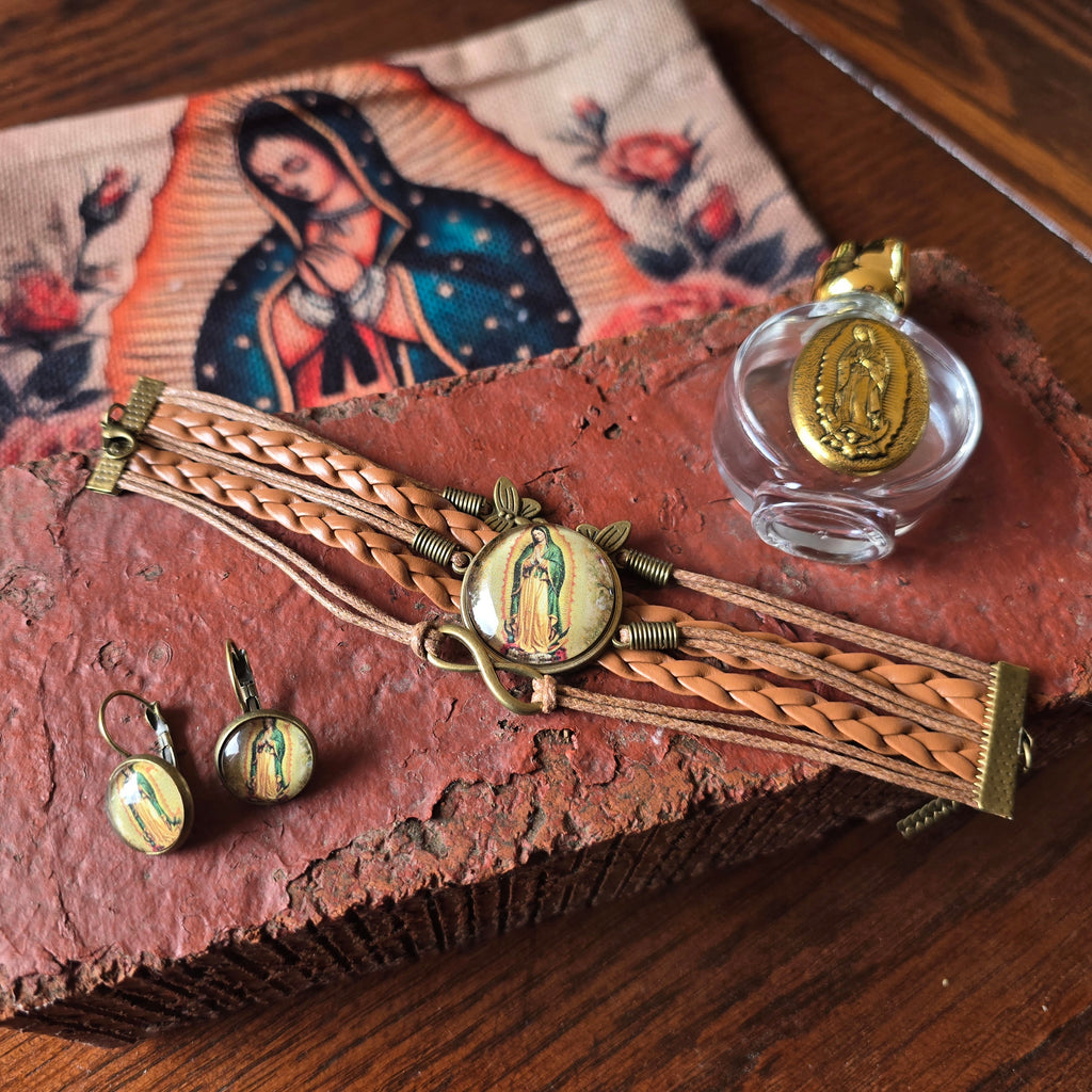 This boho style Virgin of Guadalupe jewelry set has a stylish PU leather and metal multi-string infinity bracelet with matching petite earrings. The jewelry set comes in a fabric pouch with Our Lady of Guadalupe and a glass holy water bottle.