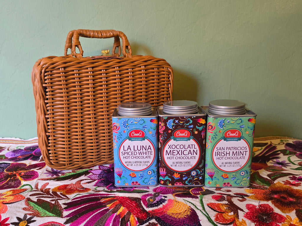 The CasaQ Artisan Hot Chocolate 3pc Wicker Picnic Tote includes 3 - 6.25 oz tins of instant hot chocolate in a wicker picnic tote with metal closure. This is the perfect gift for family, friends and colleagues to enjoy the holidays.