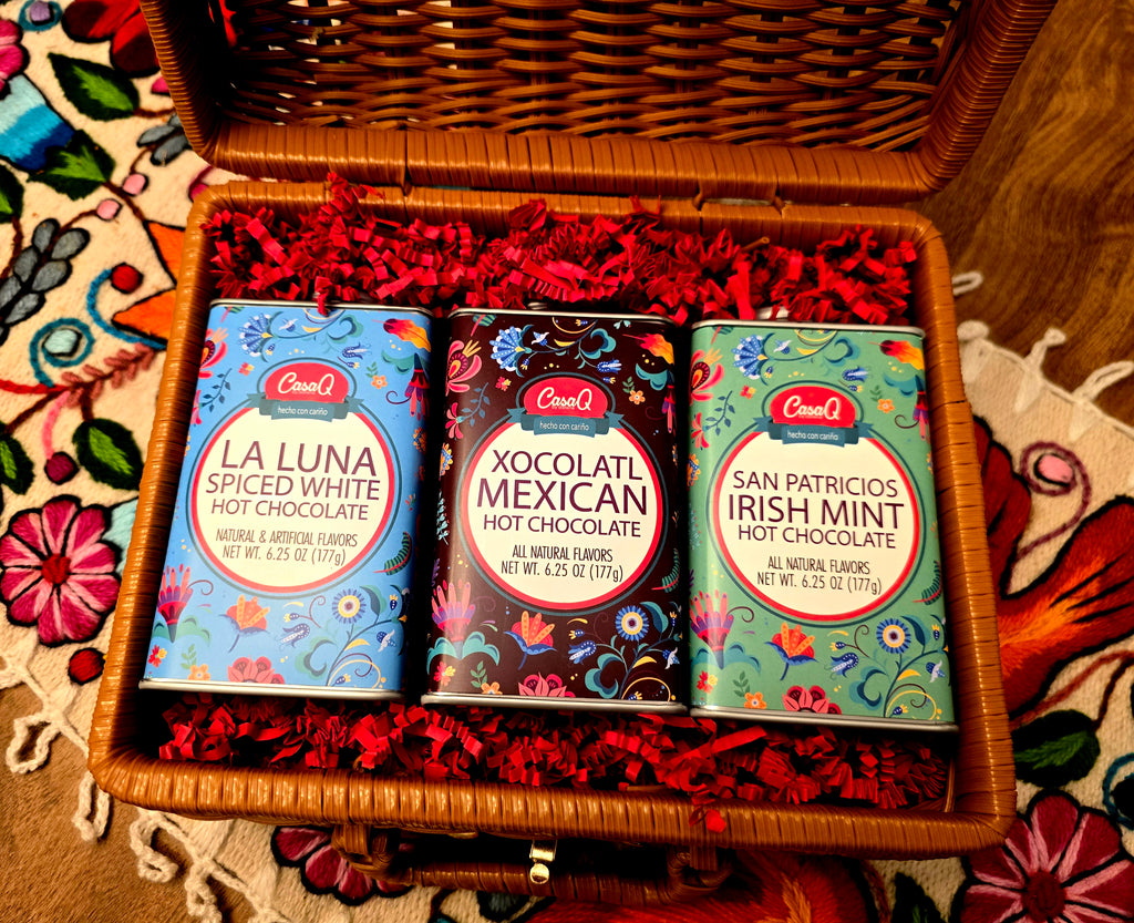 The CasaQ Artisan Hot Chocolate 3pc Wicker Picnic Tote includes 3 - 6.25 oz tins of instant hot chocolate in a wicker picnic tote with metal closure. This is the perfect gift for family, friends and colleagues to enjoy the holidays.